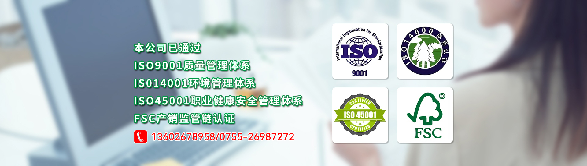 本公司已通過:ISO9001質(zhì)量管理體系、IS014001環(huán)境管理體系、ISO45001職業(yè)健康安全管理體系、FSC產(chǎn)銷監(jiān)管鏈認證!